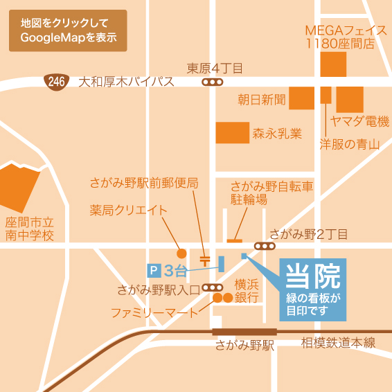 横浜銀行を左折し、道路に突き当たったら右折してください。ファミリーマート前を通過し、ステーキハウス松木の前の信号を渡り右折すると木村畳屋がありますので、直進すると当院です。